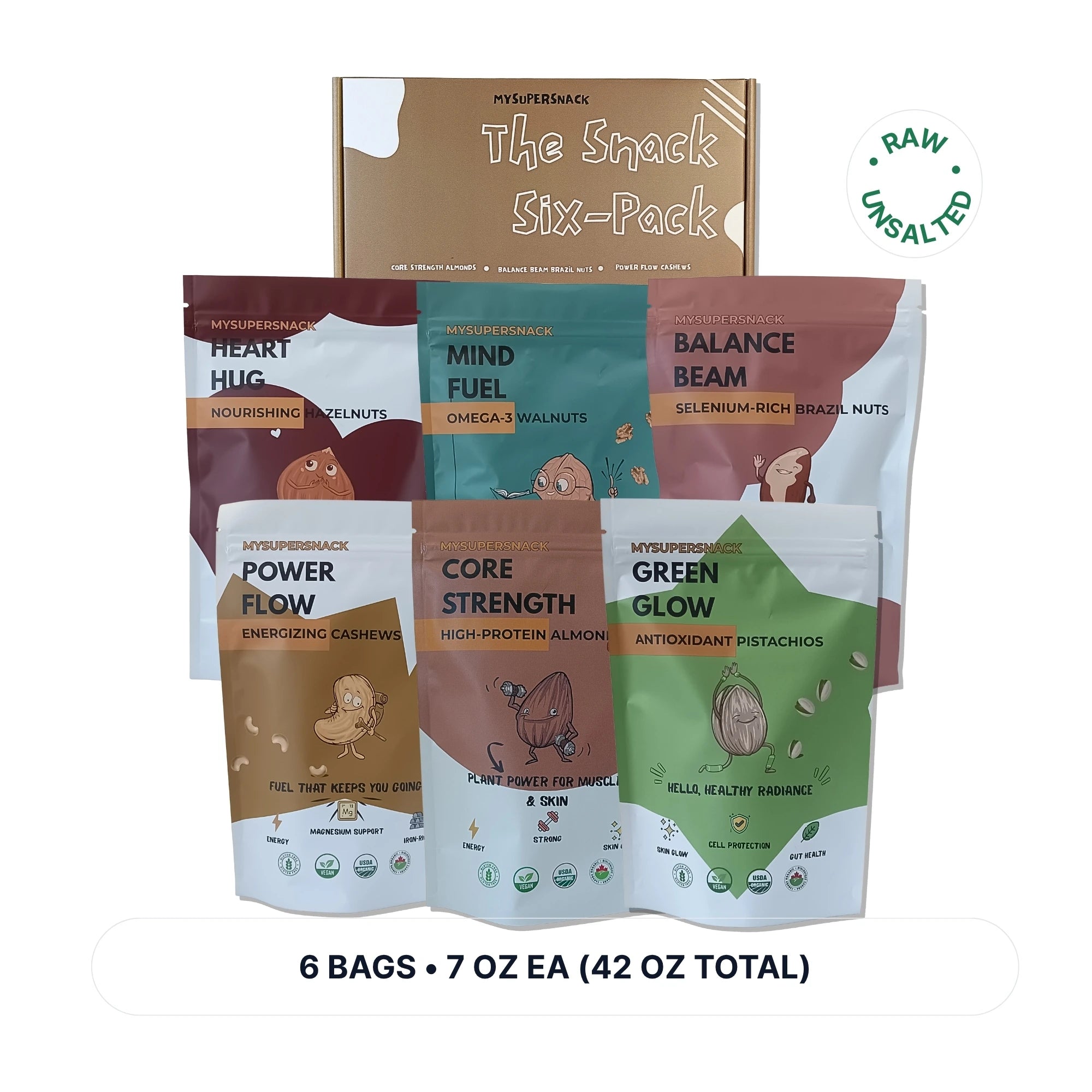 Whether you’re fueling a workout, boosting your brainpower, or simply craving a wholesome treat — The Snack Six‑Pack delivers wholesome energy, rich nutrition, and unbeatable convenience in one beautifully packaged set.
